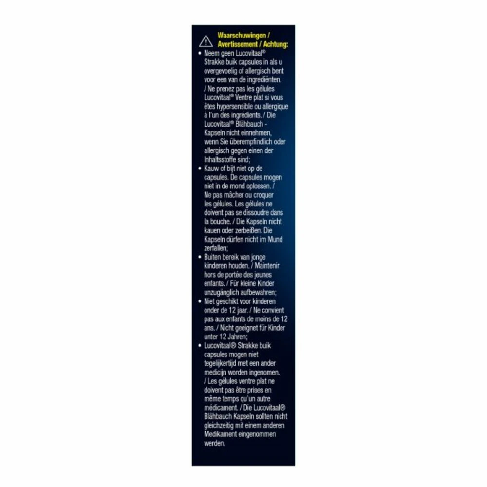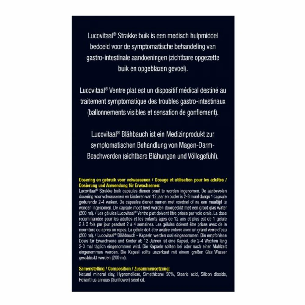 Lucovitaal Strakke BuikMedisch Hulpmiddel: Lucovitaal Strakke Buik verlicht een opgeblazen, vol gevoel. De capsules dienen als symptomatische behandeling bij klachten bij overmatige gasvorming, zure oprispingen en een oncomfortabel gevoel in de buik.Bij buikpijn en gasvormingVerlicht een drukkend opgeblazen gevoel