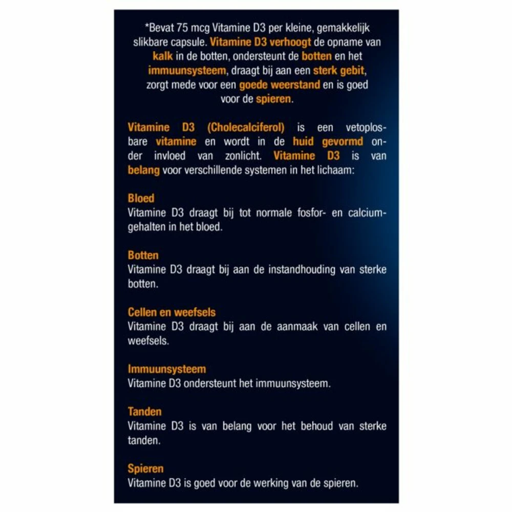 Lucovitaal Vitamine D3 75mcg ForteVitamine D3 75mcg van Lucovitaal Forte bevat maar liefst 75mcg vitamine D3 per kleine, gemakkelijk slikbare capsule. Vitamine D verhoogt de opname van kalk in de botten, ondersteunt de botten en het immuunsysteem, zorgt mede voor een goede weerstand en is goed voor de spieren. Het zorgt voor de opbouw en het behoud van sterke tanden en botten. Vitamine D wordt in de huid gevormd onder invloed van zonlicht. Inname van extra vitamine D wordt door de Gezondheidsraa
