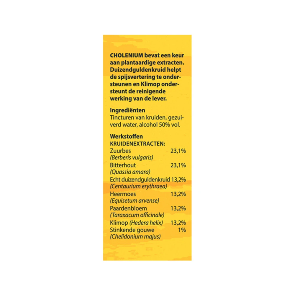 Bloem Cholenium nr 064 Lever** FormuleBloem Cholenium nr 064 is een kruidentinctuur met Klimop, Zuurbes, Bitterhout, Echte Duizendguldenkruid, Heermoes, Paardenbloem en Stinkende Gouwe.Duizendguldenkruid helpt de spijsvertering te ondersteunen en Klimop ondersteunt de reinigende werking van de lever.Klimop ondersteunt de reinigende werking van de lever* Duizendguldenkruid helpt de spijsvertering te ondersteunen*** Klimop**Duizendguldenkruid