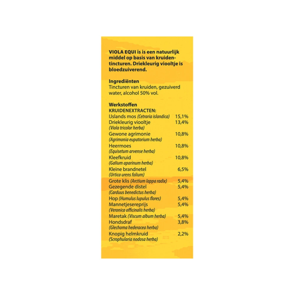 Viola Equi is bloedzuiverend*Bloem Viola Equi nr. 248 is een kruidenpreparaat met Viola Equi. De Nederlandse naam voor Viola Equi is het drie kleurig viooltje. Driekleurig viooltje heeft een bloedzuiverende werking**Gezondheidsclaim in afwachting van goedkeuring door de Europese Commissie