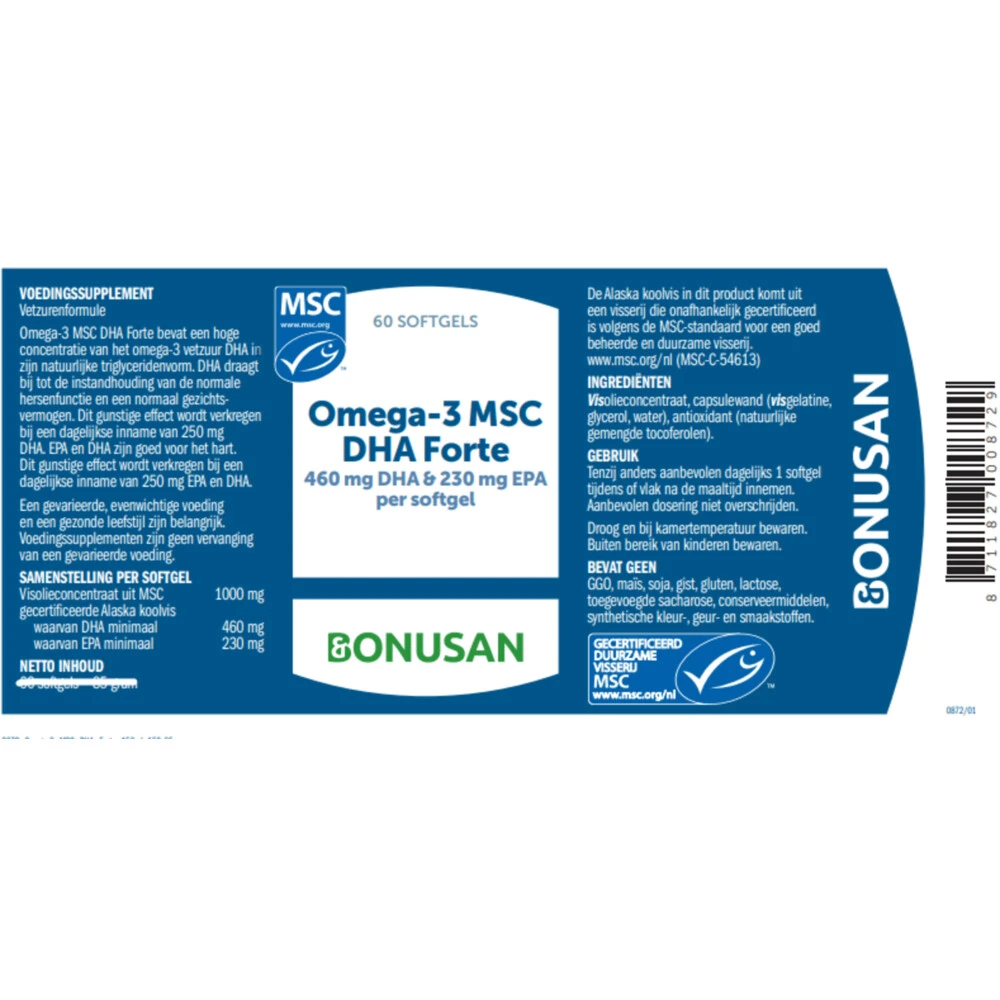 Bonusan Omega 3 MSC DHA ForteBonusan Omega 3 MSC DHA Forte bevat omega-3 in triglyceridenvorm, dit is de natuurlijke vorm zoals in ons voedsel en wordt daardoor goed opgenomenOmega-3 vetzuren, waar DHA deel van uitmaakt, zijn een groep met meervoudig onverzadigd vetzuren en belangrijke bouwstoffen voor het menselijk lichaam. Bonusan Omega 3 MSC DHA Forte bevat 460 mg DHA én 230 mg EPA per softgel. DHA en EPA zijn goed voor het hart* en houden de normale bloeddruk** in stand DHA is ee
