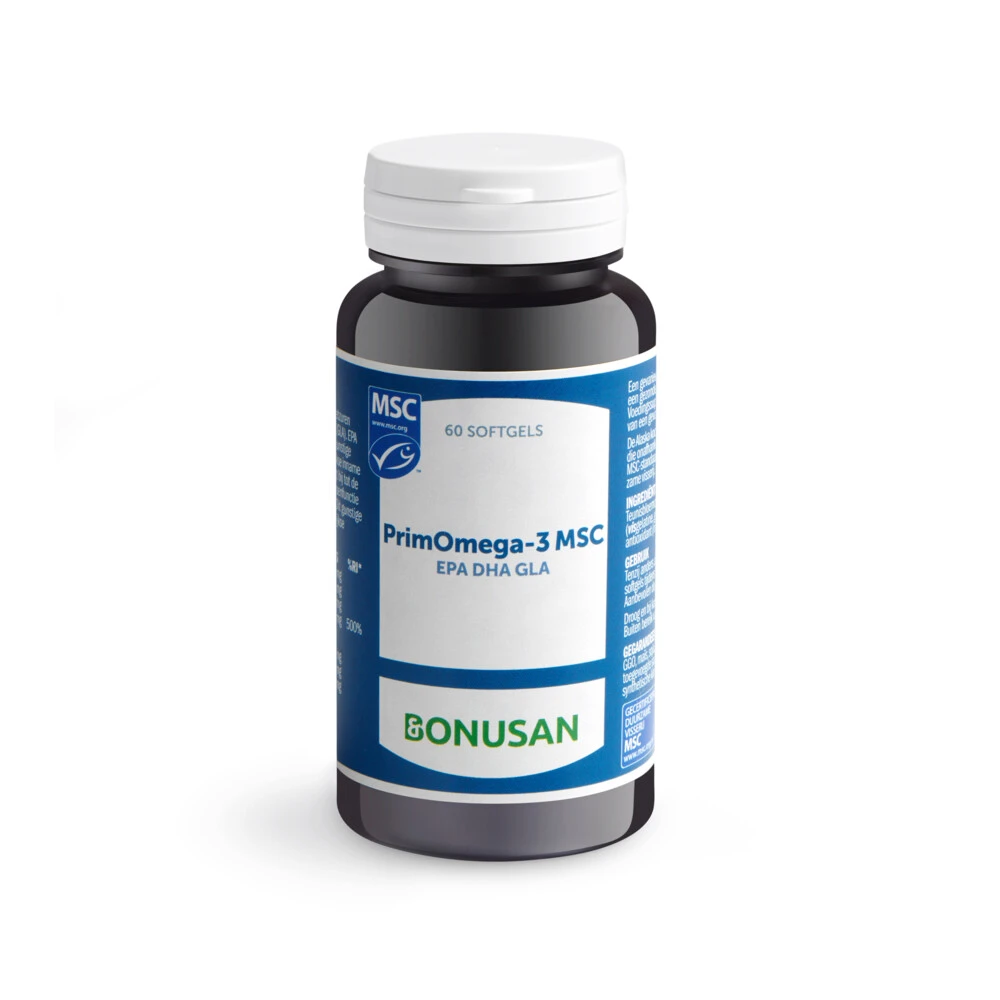 Bonusan PrimOmega 3 MSCDe Bonusan PrimOmega-3 MSC biedt een unieke combinatie van omega-3 vetzuren uit visolie èn het plantaardige omega-6 vetzuur GLA. Dat maakt Bonusan PrimOmega-3 MSC een uitgekiende dagelijkse aanvulling van die goede vetten met meerdere toepassingen waardoor het breed in te zetten is. De speciaal ontwikkelde softgels van de Bonusan PrimOmega-3 MSC zijn gemaakt van visgelatine en zijn dus vrij van runder- en varkensgelatine. De softgels zijn ook nog eens makkelijk slik