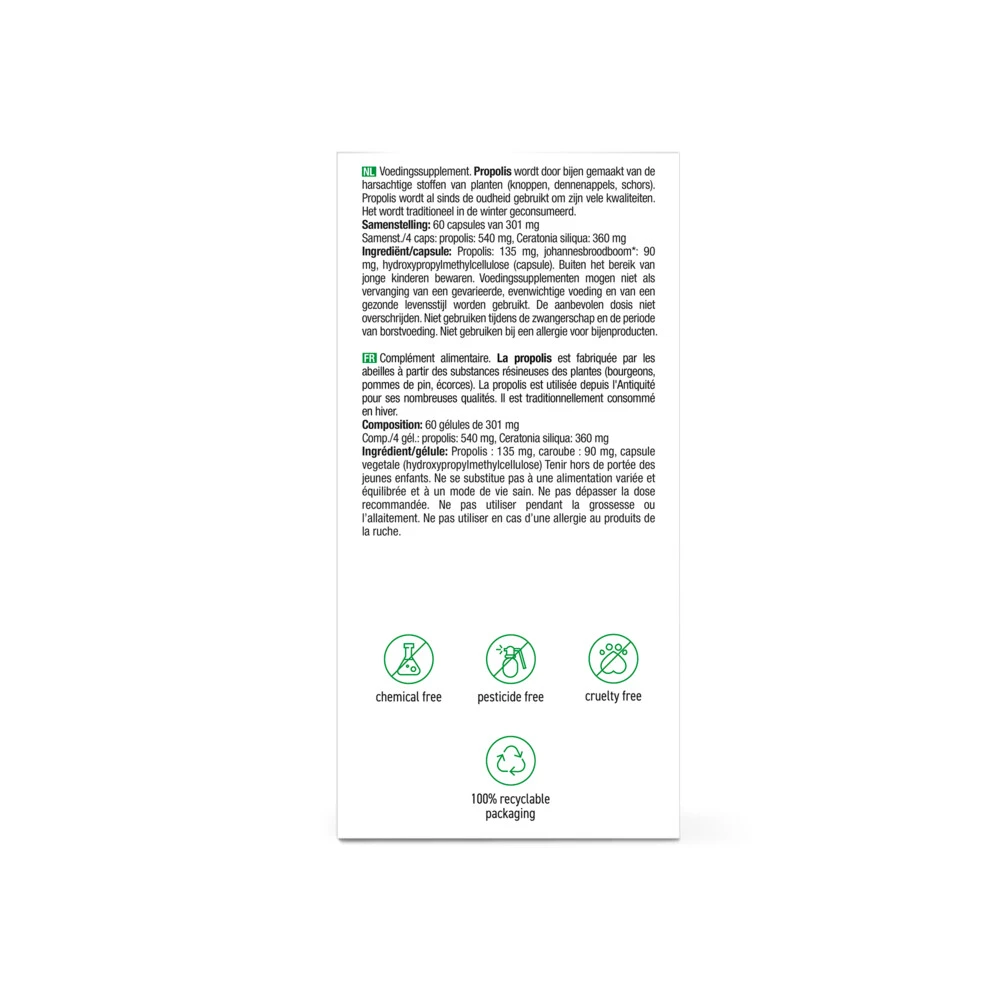 Purasana Propolis 135 mgPurasana Propolis wordt door bijen verzameld van bladknoppen en de schors van met name populieren, kastanjebomen en naaldbomen. De bijen gebruiken het samen met bijenwas voor het vormen van de bijenkorf. Propolis wordt daarom ook wel aangeduid als bijenkorfcement. De harsachtige stof is opgebouwd uit een groot aantal verschillende ingrediënten, waaronder ook plantaardige balsems, wasachtige stoffen, essentiële oliën en pollen. Door toevoeging van enzymen do