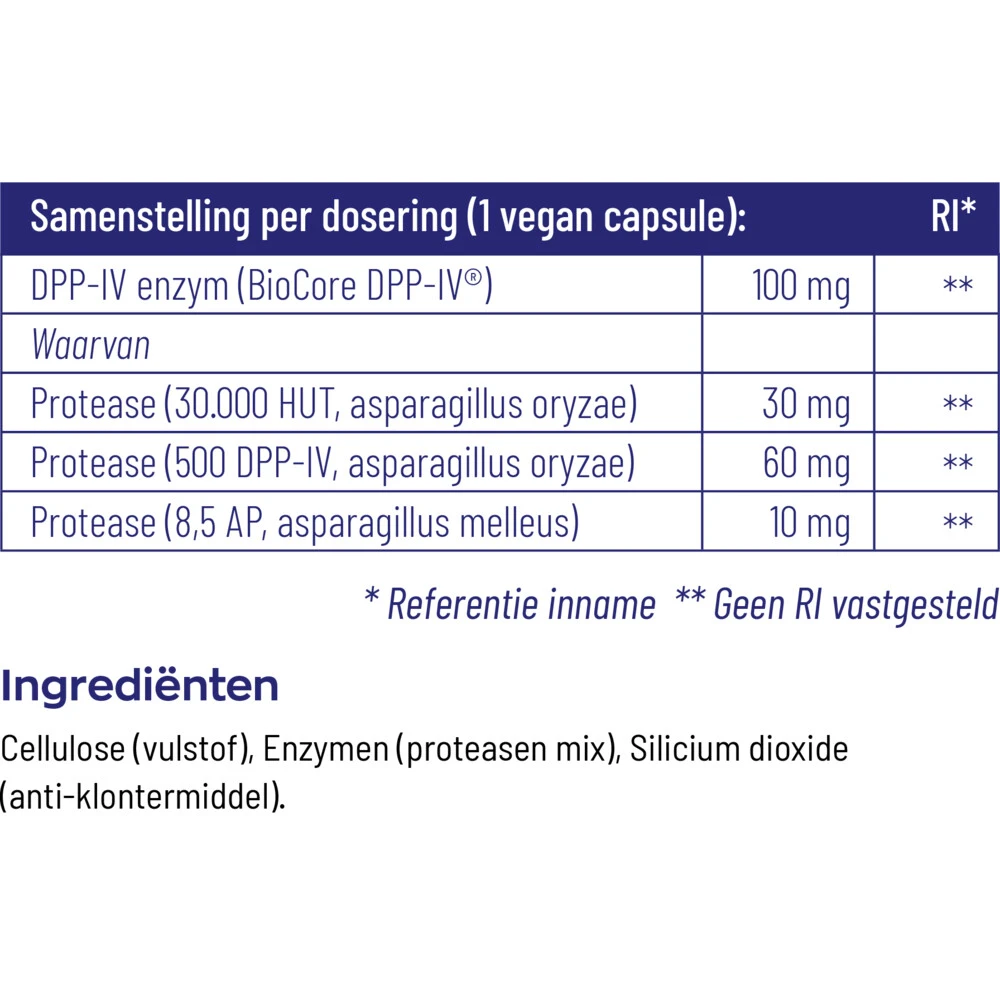 Vitakruid DPP-IV UltimateVitakruid DPP-IV Ultimate is een voedingssupplement dat BioCore DPP-IV bevat en speciaal ontwikkeld is voor degenen die glutengevoelig zijn en iedereen die moeite heeft met het verteren van graan bevattende producten. DPP-IV betekent dipeptidylpeptidase IV en is een eiwitsplitsend enzym die door het lichaam zelf, bijvoorbeeld in de darm, wordt aangemaakt. Het enzym speelt een belangrijke rol bij de afbraak van voedingseiwitten als gluten. DPP-IV Ultimate bevat BioCore DP