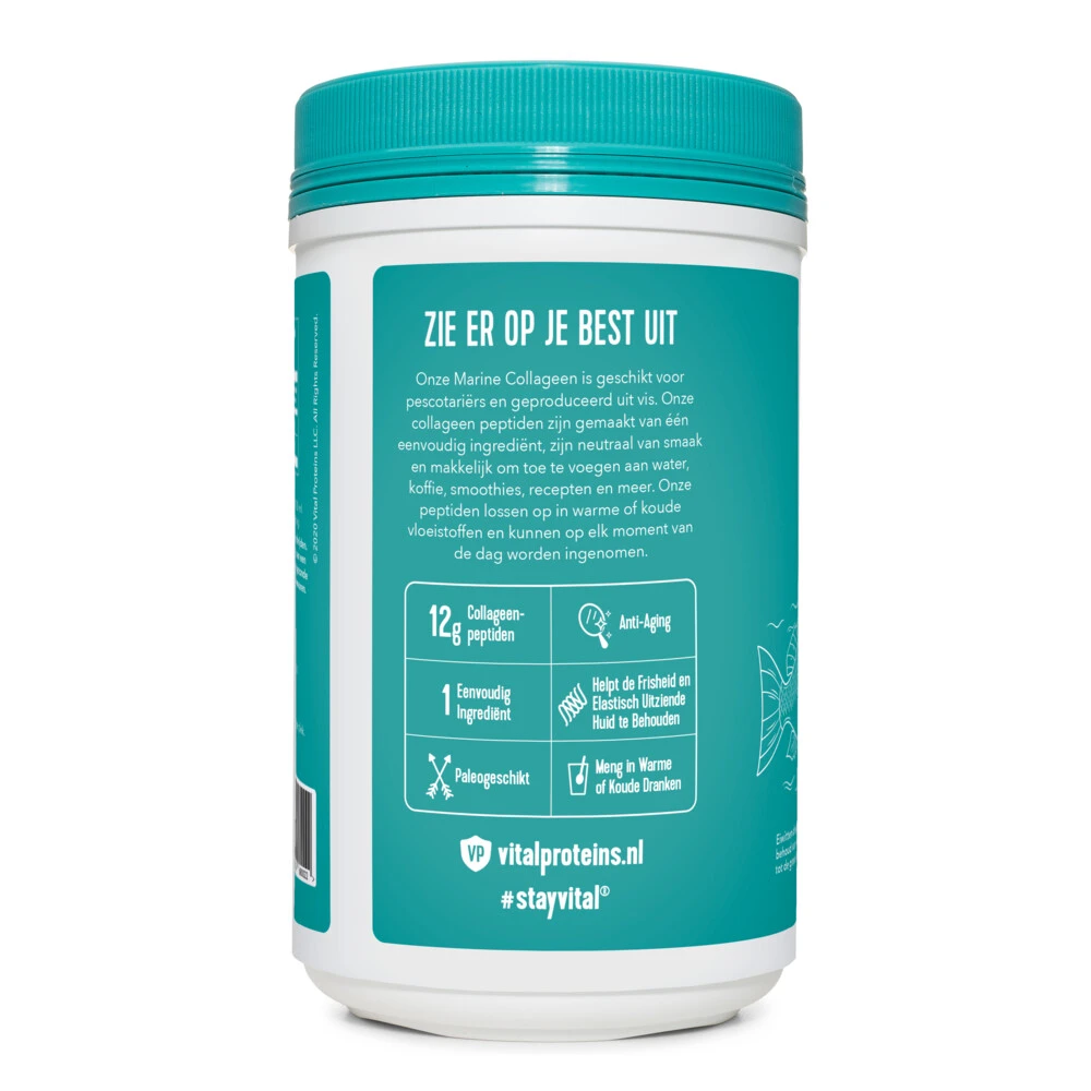 Vital Proteins Marine Collageen Vital Proteins Marine Collageen is een premium eiwit dat gemaakt is van zeedieren. Marine Proteins Collageen – een niet-gearomatiseerd poeder bevat 12 g hoogwaardige witte viscollageenpeptiden per portie.Collageen is een belangrijk structureel eiwit dat prominent aanwezig is in je haar, huid en nagels, maar ook in bindweefsel, pezen, ligamenten en botten.Ondersteunt gezond haar, huid, nagels en gewrichtenBiobeschikbaar: verteerd en snel opgenomen door h