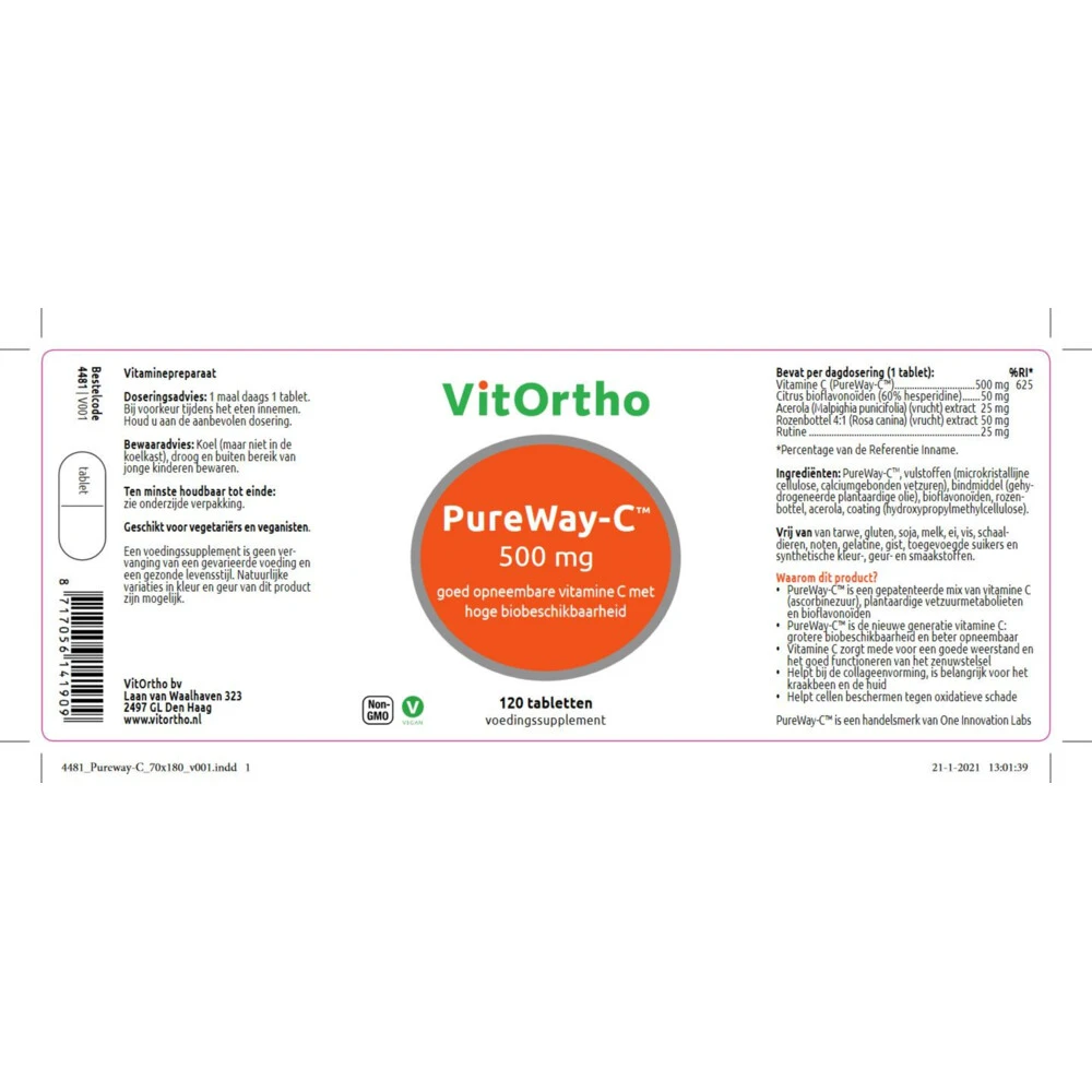 Vitortho Vitamine C PureWay-C 500 mgPureway C Tabletten 500mg van Vitortho is een mix van vitamine C, vetzuurmetabolieten en bioflavonoïden. Door deze combinatie is de vitmamine C beter opneembaar. Vitamine C zorgt mede voor een goede weerstand en het goed functioneren van het zenuwstelsel.Kenmerken van Vitortho Vitamine C PureWay-C 500 mgPureWay-C™ is een gepatenteerde mix van vitamine C (ascorbinezuur), plantaardige vetzuurmetabolieten en bioflavonoïden.PureWay-C™ is de n